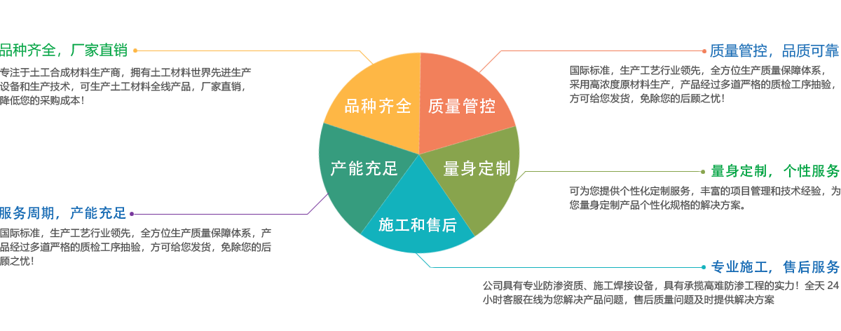 公司所有產(chǎn)品均采用國際標準組織生產(chǎn),并經(jīng)國家、市技術監(jiān)督局采標驗收,生產(chǎn)工藝及水平全國領先,屬國內(nèi)優(yōu)等水平,實物質量達到國際先進水平。經(jīng)用戶、施工單位使用證明,質量穩(wěn)定可靠、施工方便、價格合理、售后服務完善。產(chǎn)品主要應用于農(nóng)業(yè)、海綿城市建設、公路、鐵路、垃圾填埋場防滲,水利、電力、水土保持及環(huán)境綠化與基礎建設領域,已被廣泛應用于高速公路、鐵路、垃圾填埋場等多項國家重點工程,受到工程界專家及廣大用戶的一致好評。